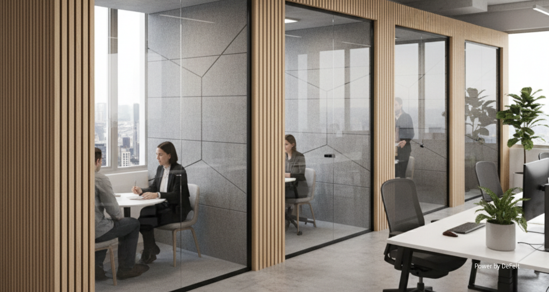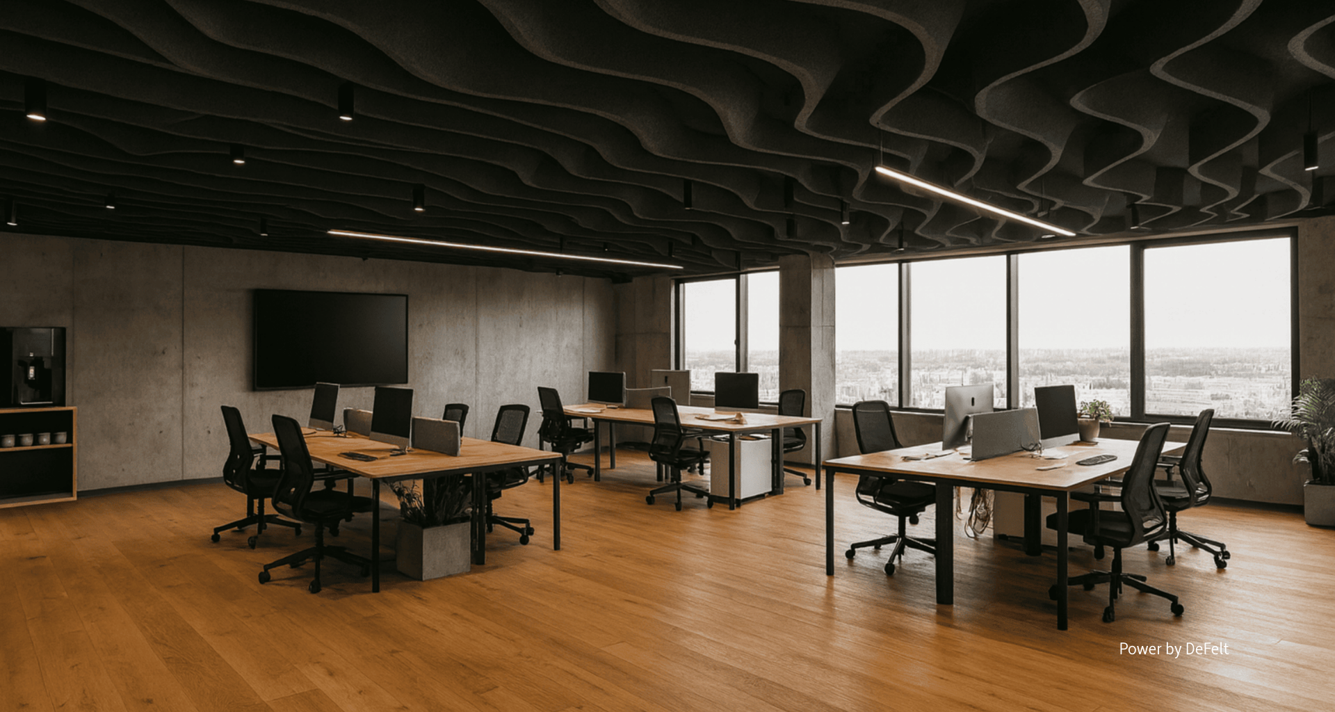 Panele akustyczne z filcu DeFelt skutecznie redukują pogłos i tłumią dźwięk, wyraźnie podnosząc komfort akustyczny pomieszczenia.