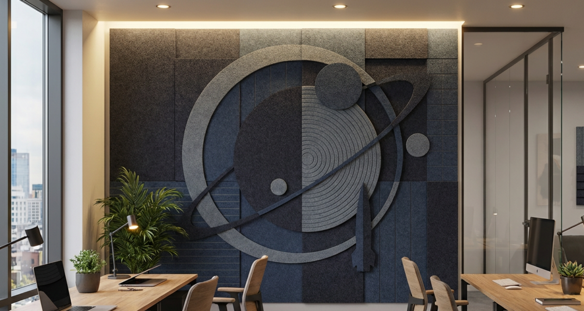 Płyty z filcu akustycznego można personalizować poprzez frezowanie czy nadruk, co pozwala na stworzenie spójnej wizualnie aranżacji wnętrza.